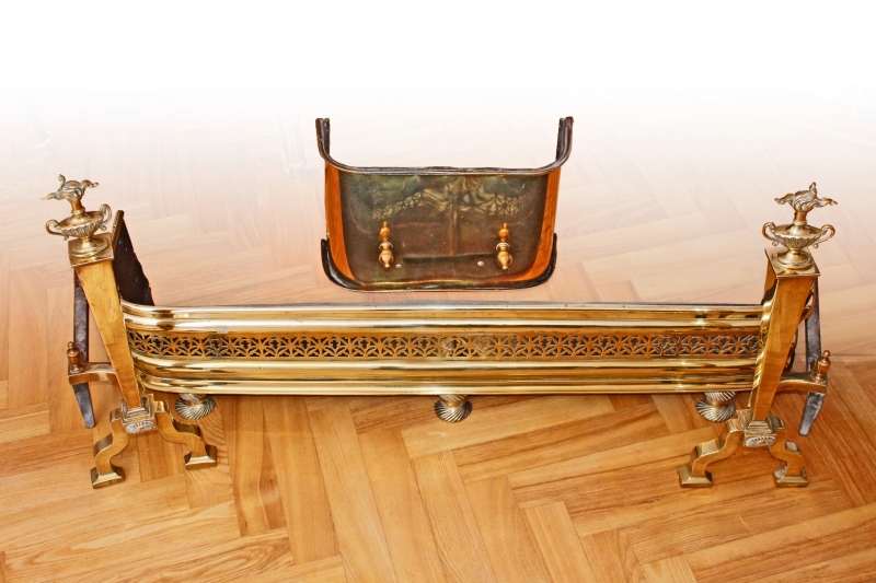 Akcesoria kominkowe z mosiądzu, wysokie wilki (ang. firedogs, andirons), ze zwieńczeniem w kształcie płonących wazonów, XIX w. Wymiary: 60cm wysokie.Osłona kominkowa (niska metalowa ścianka przy kominku, ang. fender) przed żarem, sadzą i popiołem, epoka Regency (c.1800-1820), na trzech spiralnie skręconych nóżkach. Wymiary: 115 cm szeroka, 25 cm wysoka.Mosiężna osłona (tzw. trivet), w kształcie litery D. Wymiary: 45 cm szeroka, 16 cm wysoka.