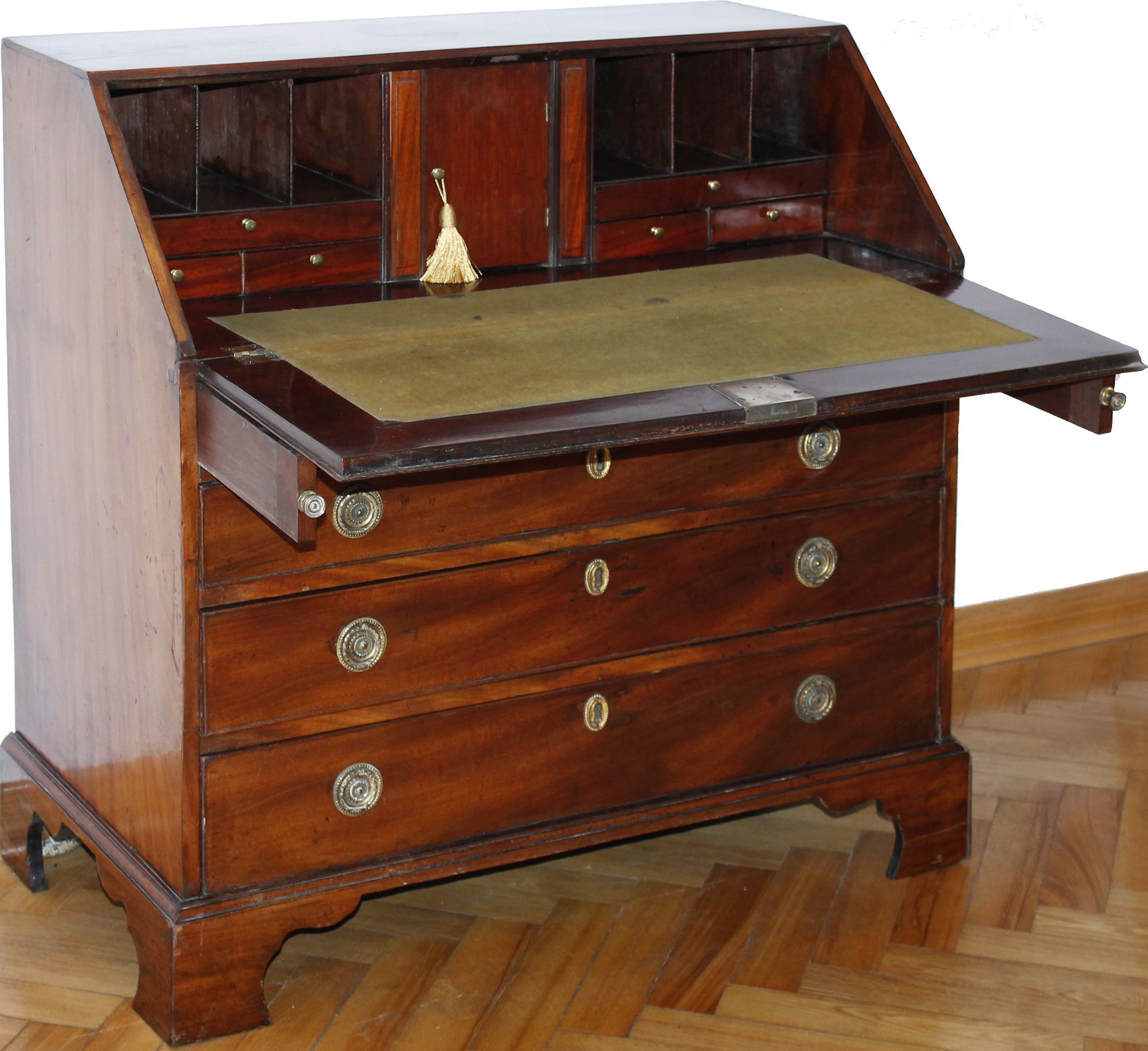Klasyczny mahoniowy angielski sekretarzyk, tzw. 'bureau', z epoki króla Jerzego III (George III), z lat 1760-1820, z otwieranym blatem, czterema szufladami zamykanymi na klucz, okrągłymi mosiężnymi uchwytami. Wnętrze sekretarzyka ma sześć przegródek, sześć szufladek, centralna szafkę, oraz dwie sekretne skrytki. Blat jest wyłożony zielonym suknem; kilka plam z atramentu. Dobry kolor i patyna.Wymiary: 90 cm szeroki, 47 cm głęboki, 90 cm wysoki, blat: 54 x 86 cm.