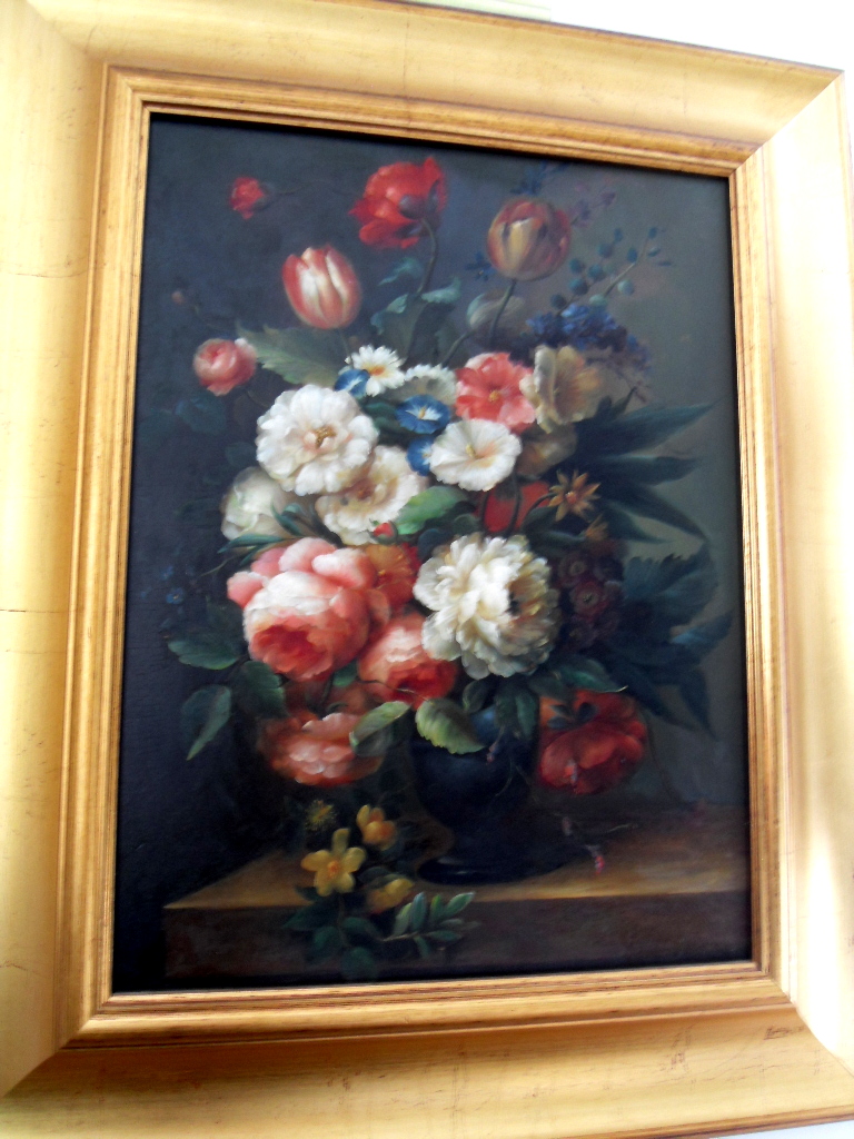 w szerokiej złotej ramie, olej na desce, w stylu XVII-w. holenderskich martwych