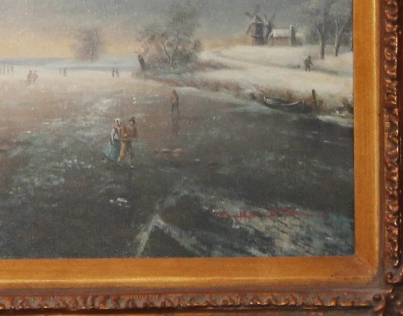 Obraz namalowany w stylu XVII-w. holenderskich i flamandzkich scen zimowych.